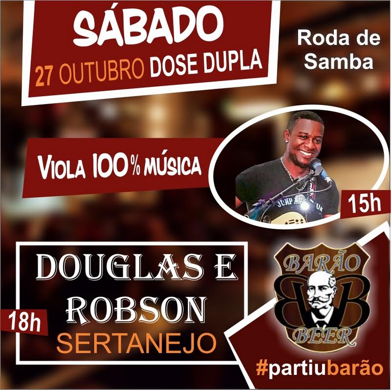 – Sábado, dia 27 de Outubro de 2018 roda de Samba a partir das 15h00 com Viola 100% Música e a partir das 18h00 Sertanejo com Douglas e Robson