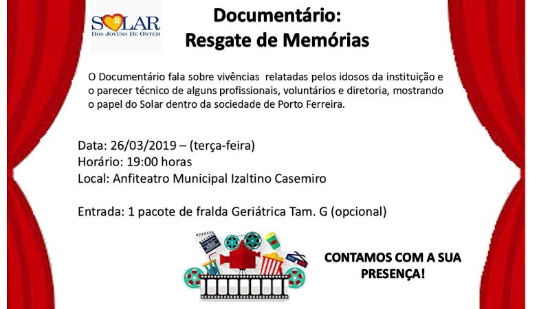 Depois do processo de filmagem e edição, finalmente o documentário Resgate de Memória será lançado ao público na próxima terça-feira, dia 26 de março, às 19:00hs no anfiteatro municipal de Porto Ferreira – Isaltino Casemiro.