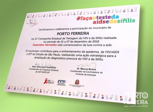 O Governo do Estado de São Paulo, por meio da Coordenadoria da Campanha Fique Sabendo e da Coordenadoria do Programa Estadual de DST/Aids, entregou um certificado à Secretaria de Saúde de Porto Ferreira com cumprimentos pela participação na 11ª Campanha Estadual de Testagem do HIV e da Sífilis, realizada entre 1 e 7 de dezembro do ano passado, dentro do “Dezembro Vermelho”, mês comemorativo de luta contra a Aids.