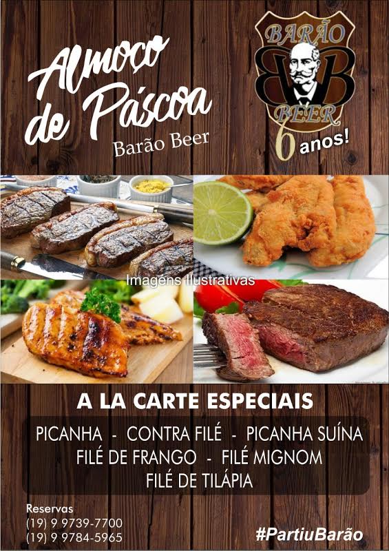 Domingo 21-04-2019 Almoço de Pascóa no Barão Beer – A La Carte Especiais ( Picanha – Picanha Suína – Contra Filé – Filé de Frango – Filé de Tilápia – Filé Mignon)