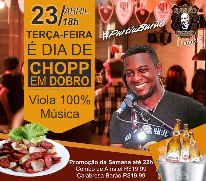 Hoje terça-feira 23-04 Chopp em dobro no Barão Beer e animação de Viola 100% Música a partir das 18h00.