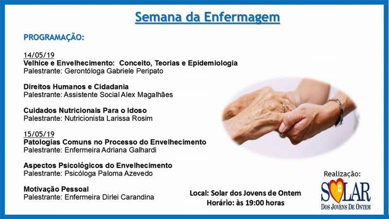 Em comemoração ao dia Internacional da Enfermagem e do Enfermeiro, comemorado anualmente no dia 12 de maio, o Solar dos Jovens de Ontem, realizará a Semana de Integração na Enfermagem, nos dias 14 e 15 de Maio. Em seus respectivos dias, o evento será realizado no próprio Solar dos Jovens de Ontem e iniciará às 19:00 hs, com ciclo de palestras voltadas para o trabalho da enfermagem na ILPI (Instituição de Longa Permanência para Idosos.