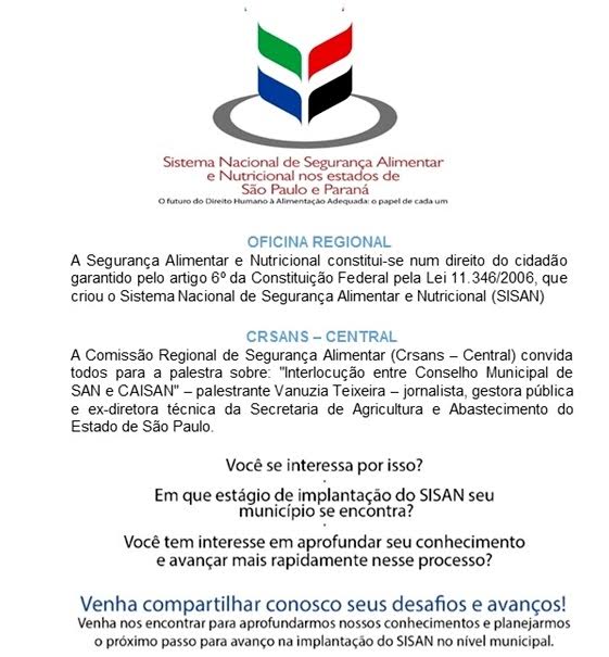 A palestra será ministrada por Vanuzia Teixeira, jornalista, gestora pública e ex-diretora técnica da Secretaria da Agricultura e Abastecimento do Estado de São Paulo. O tema será “Interlocução entre Conselho Municipal de Segurança Alimentar e Nutricional e Câmara Intesecretarial de Segurança Alimentar e Nutricional”.