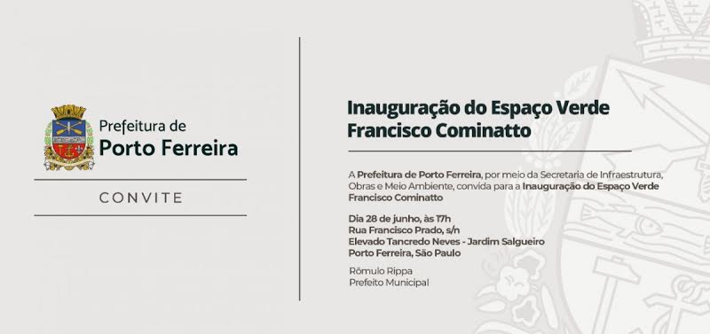 A Prefeitura de Porto Ferreira inaugura nesta sexta-feira (28/06), às 17 horas, o Espaço Verde Francisco Cominatto, localizado ao lado do elevado Tancredo Neves, o popular “Minhocão”, na Vila Salgueiro.