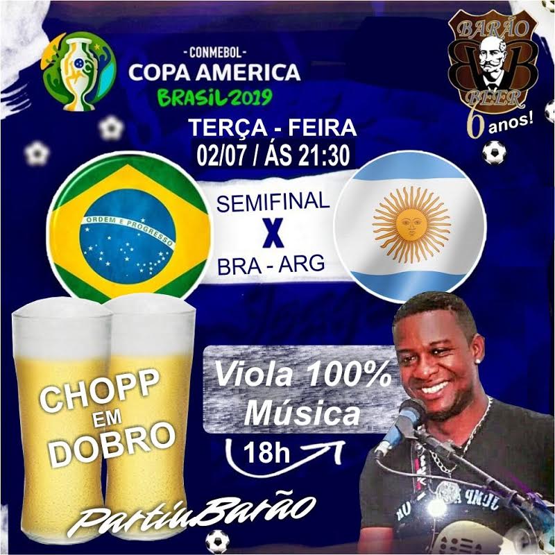 Hoje, terça-feira 02-07 a partir das 18h00 animação com Viola 100% Música, chopp em dobro e Semi-final da Copa América Brasil x Argentina a partur das 21h30