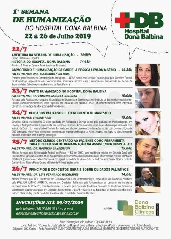Serão cinco dias de palestras, as quais ocorrerão no Auditório “Rubens Costa Valente” do Hospital Dona Balbina, entrada pela Portaria de serviços na rua João Miranda Salgueiro nº 300 – Porto Ferreira.