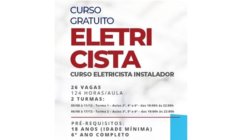 O Senai (Serviço Nacional de Aprendizagem Industrial), por meio do Centro de Formação Profissional Irpo Perondi, da Prefeitura de Porto Ferreira, receberá nos dias 30 e 31 de julho (terça e quarta-feira) as inscrições para o curso de eletricista instalador.