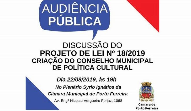 O debate será na quinta-feira (22/08), a partir das 19h, no Plenário Syrio Ignáticos, localizado na avenida Engenheiro Nicolau Vergueiro Forjaz, 1068. O projeto em discussão visa criar o Conselho Municipal de Política Cultural de Porto Ferreira (COMCULTPF).