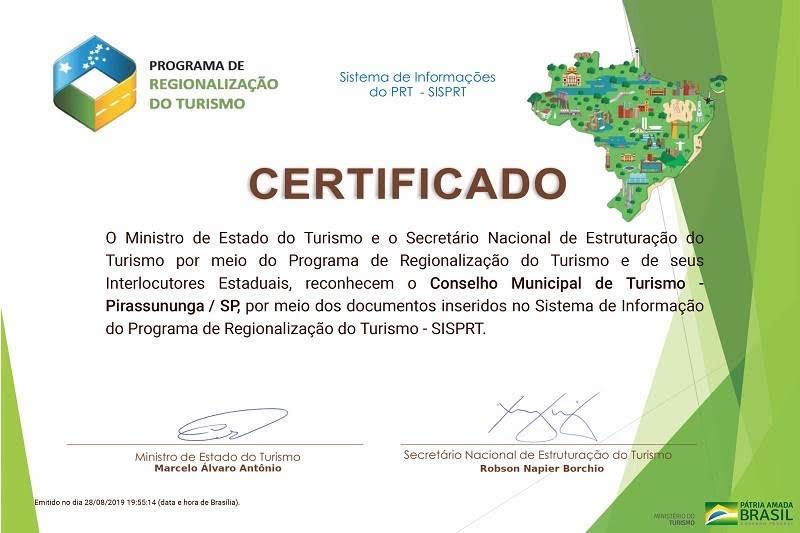 A certificação é uma maneira de comprovar que o município está inserido no Mapa e faz parte do rol de destinos brasileiros que trabalham o turismo como política de desenvolvimento econômico e geração de emprego e renda.