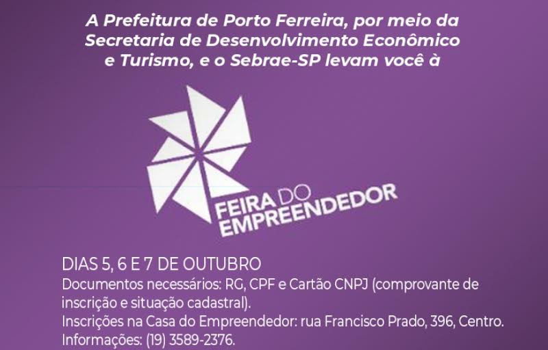 A Prefeitura de Porto Ferreira, por meio da Secretaria de Desenvolvimento Econômico e Turismo, em parceria com o Sebrae-SP, levará empresários da cidade para o maior evento de empreendedorismo do Brasil, a Feira do Empreendedor 2019, que acontece no Anhembi Parque, em São Paulo.