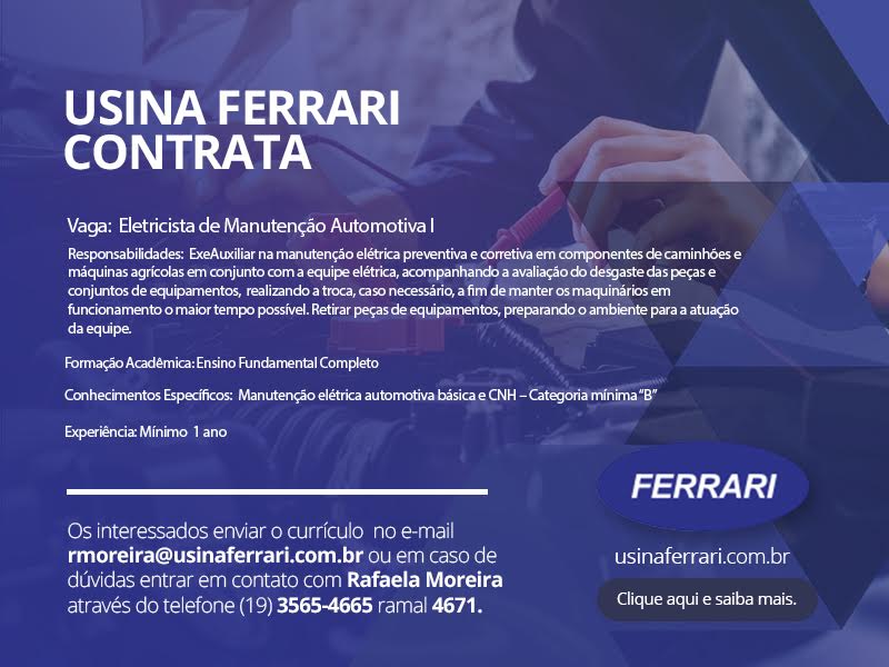 Interessados pela vaga enviar currículum para o email rmoreira@usinaferrari.com.br ou dúvidas contatar o fone (19) 3565-4665