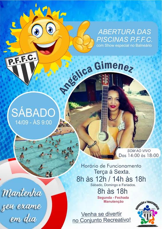 Sábado (14) Abertura das piscinas a partir das 09h00, animação com show ao vivo de Angélica Gimenez das 14h00 as 18h00. "Venha se divertir no Conjunto Recreativo"