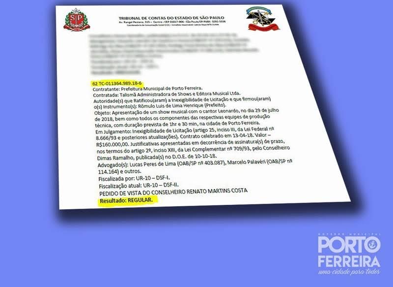 1 – A contratação do show do cantor Leonardo foi julgada REGULAR pelo Tribunal de Contas do Estado na 14ª Sessão Ordinária da Segunda Câmara, realizada às 10 horas do dia 21 de maio de 2019, no Auditório “Professor José Luiz de Anhaia Mello”.