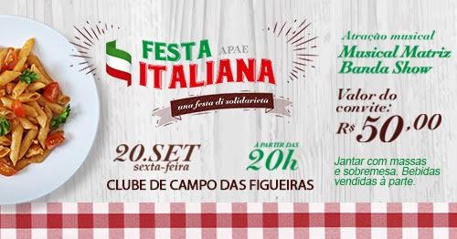 A Apae de Porto Ferreira realiza nesta sexta-feira (20/09) a sua Tradicional da Festa Italiana, trata-se da Terceira Edição, no salão social do Clube de Campo das Figueiras, a partir das 20 horas.