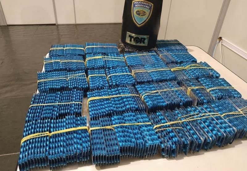 Os policiais vistoriaram o carro e encontraram 20 mil comprimidos de estimulante sexual sem nota fiscal dentro de uma mala.