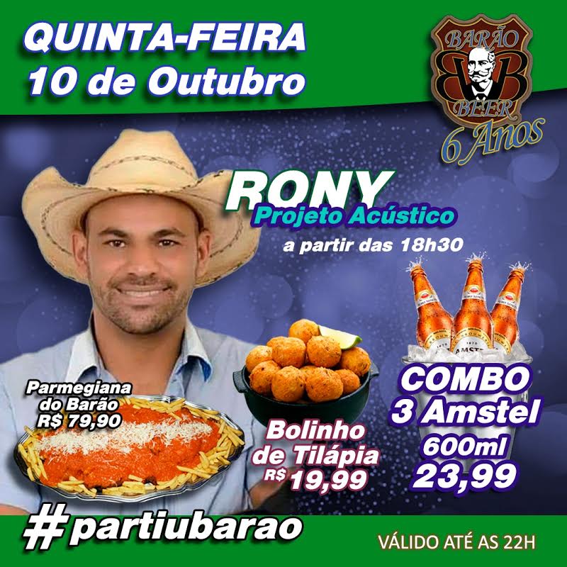 Quinta-feira (10) animação com Rony Projeto Acústico a partir das 18h30