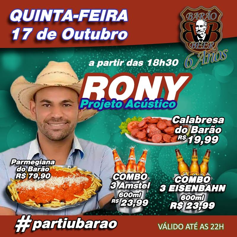 Quinta-feira (17) animação com Rony Projeto Acústico a partir das 18h30
