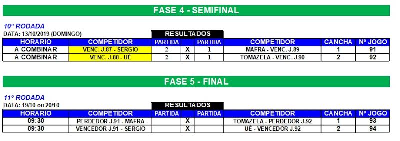Por fim, vitórias de Uê e Sergio Burian. As partidas das finais serão marcadas para o próximo fim de semana, devendo ser realizadas no sábado (19) ou no domingo (20), pois depende da Liga Sãocarlense de bocha averiguar o jogo entre Clube de Campo das Figueiras e Redenção, que pode ser no sábado ou domingo, pela Copa Dantas de Bocha.