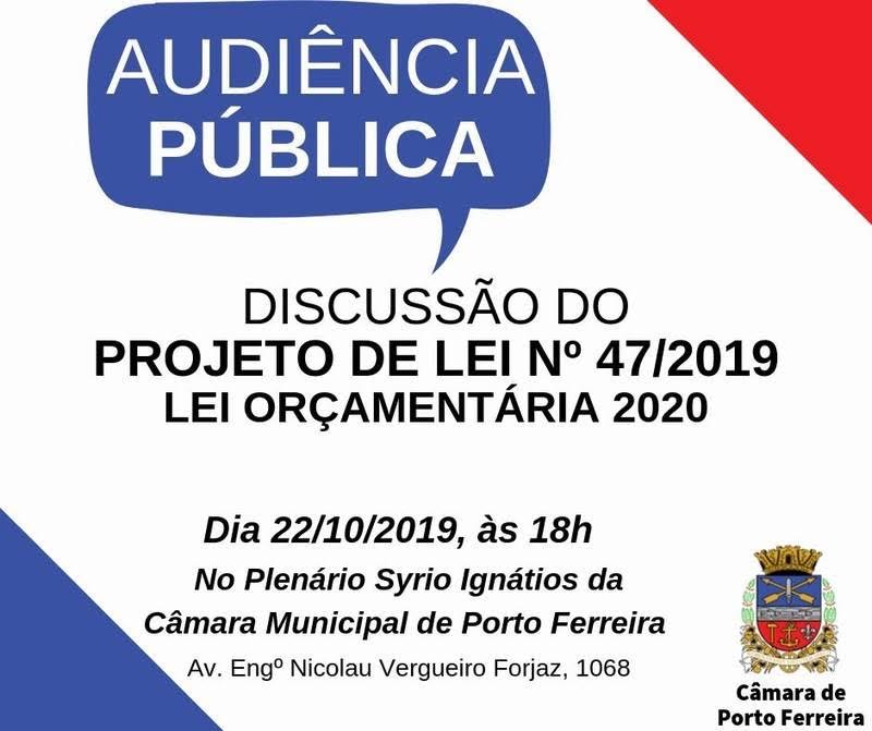 A Câmara Municipal de Porto Ferreira realiza, na próxima terça-feira (22/10), a partir das 18h, audiência pública para discutir o Projeto de Lei nº 47/2019 que estima a receita e fixa despesa para o exercício de 2020, a chamada Lei Orçamentária.