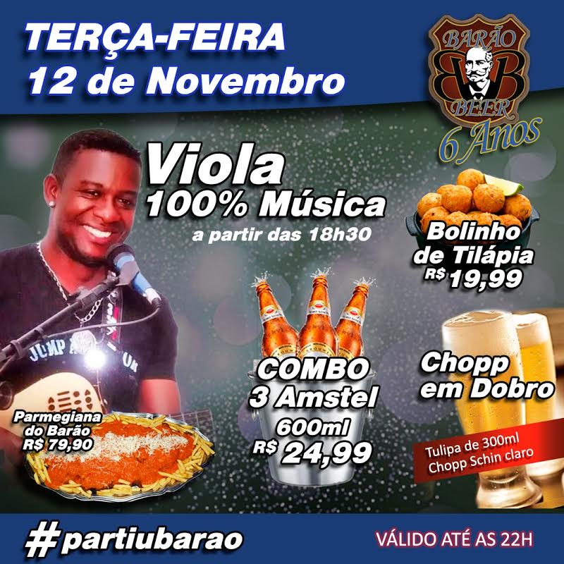 Hoje terça-feira 12 de Novembro de 2019, chopp em dobro a partir das 16h00 (chopp skin 300 ml) e animação de Viola 100% Música a partir das 18h30.