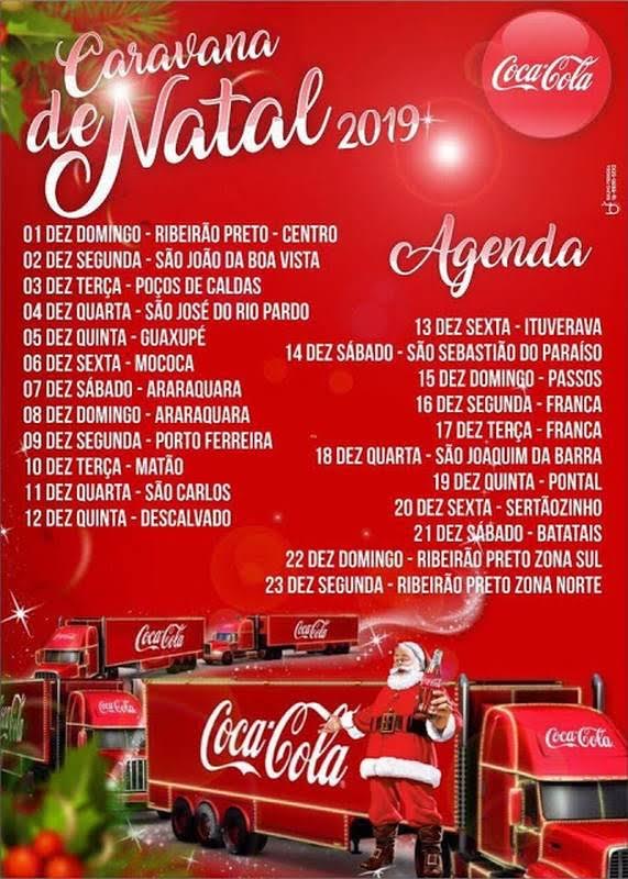 Veja na imagem a agenda com dias e cidades por onde a Caravana de Natal da Coca-Cola 2019 passará em nossa região.