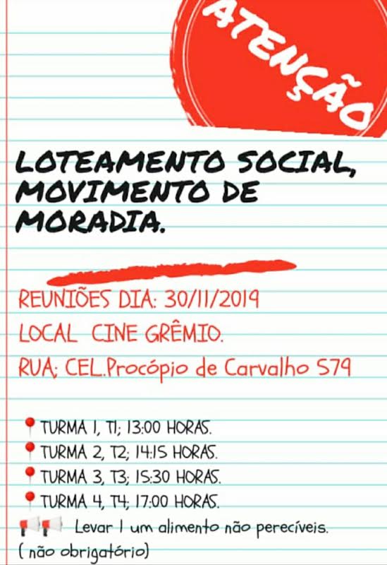 Amanhã 30/11 partir das 13h00, acontecerá no cine Grêmio Ferroviária situado a rua Cel. Procópio de Carvalho nº 579, Centro de Porto Ferreira a reunião mensal do Projeto Loteamento Social Movimento de Moradia.