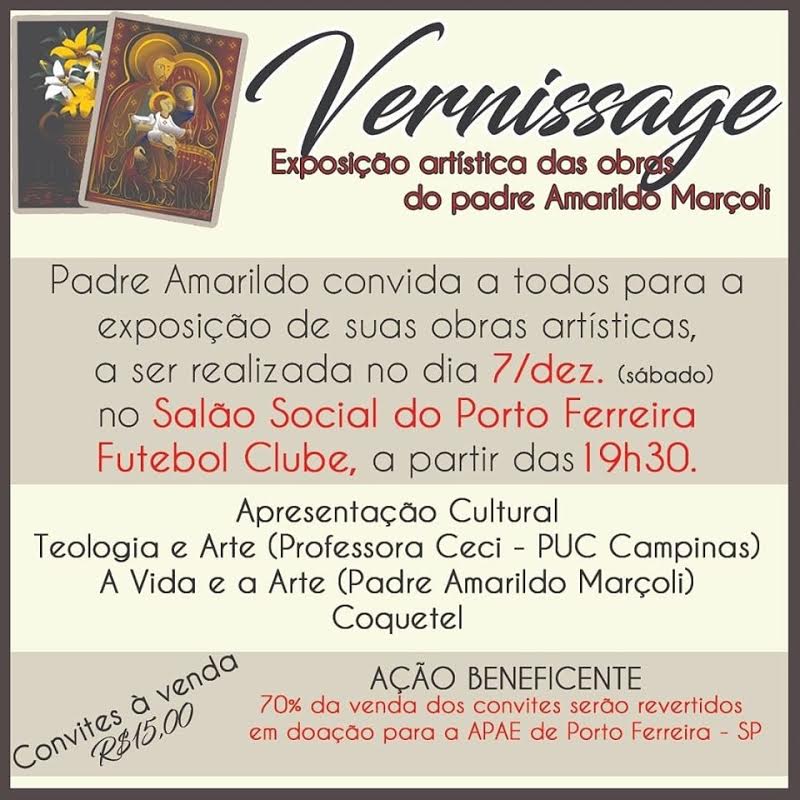 Acontece no próximo sábado (07), as 19:30 h., no salão social do Porto Ferreira Futebol Clube, o 1º. Vernissage com a exposição artística das obras do Reitor do Santuário São Sebastião, Padre Amarildo Marçolli, e em seguida, a palestra com o tema Teologia e Arte ministrada pela Sra. Ceci Mariani, professora da pós-graduação em Ciências da Religião da PUC Campinas. Ao final, será servido coquetel aos presentes.
