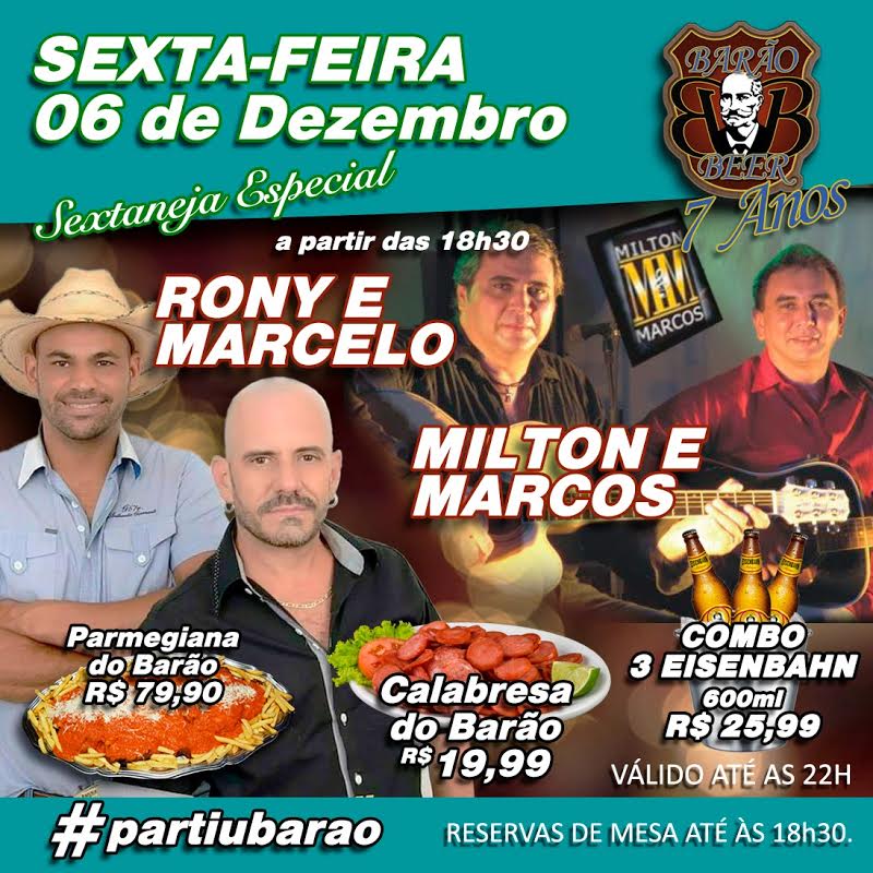 Hoje sexta-feira 06 de Dezembro, Sextaneja Especial animação de Rony e Marcelo, Milton e Marcos a partir das 18h30