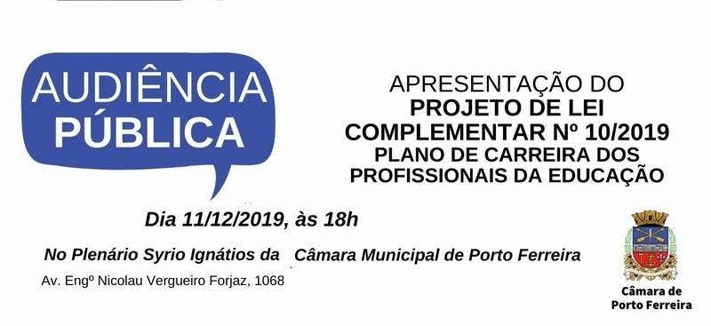 Na tarde desta quarta-feira (11/12), a partir das 18h, a Câmara Municipal de Porto Ferreira realizará a primeira audiência pública para apresentar o Projeto de Lei Complementar nº 10/2019 que institui o Plano de Carreira e o Estatuto dos Profissionais da Educação no município de Porto Ferreira.