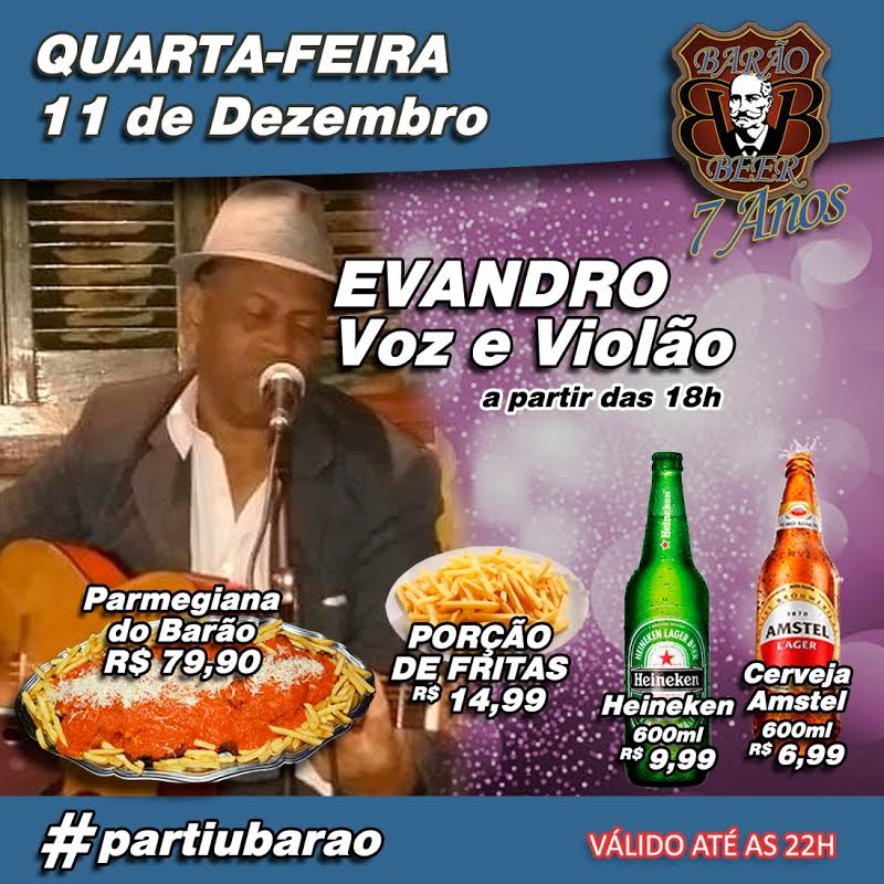 Quarta-feira 11-12 a partir das 18h00 animação a partir das 18h00 com Evandro Voz e Violão