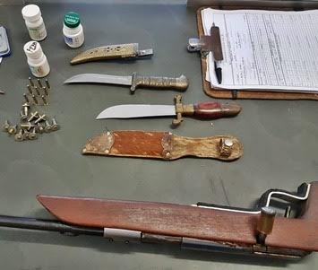 Foi então realizada vistoria na casa, na qual em um dos quartos foi localizado, dentro do guarda roupas, munições de calibre 22 escondidas dentro de um frasco de remédios e duas facas, além disso: atrás do mesmo móvel foi encontrada uma espingarda de fabricação caseira adaptada para calibre 22 com supressor de ruído.