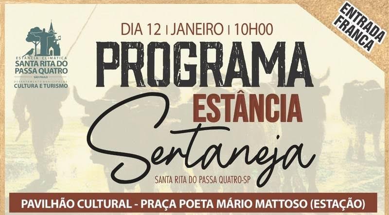 O segundo "Programa Estância Sertaneja", com apresentação de Juliano Modena, que valoriza a cultura caipira ocorrerá no próximo domingo, dia 12/01 a partir das 10 horas, com entrada gratuita no pavilhão cultural Praça Mario Matoso Estação em Santa Rita do Passa Quatro