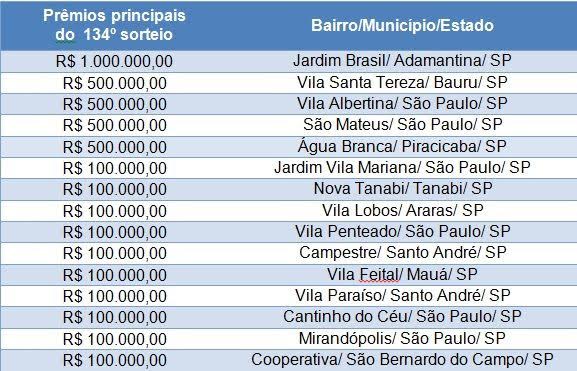 Uma moradora de Adamantina foi a ganhadora do prêmio principal da Nota Fiscal Paulista, no valor de R$ 1 milhão. A 134ª edição do programa também sorteou quatro prêmios no valor de R$ 500 mil que saíram para um consumidor de Bauru, um de Piracicaba e dois da capital. No sorteio exclusivo para entidades, os cinco prêmios de R$ 100 mil saíram para Cordeirópolis, Colina, Franca e dois para capital.