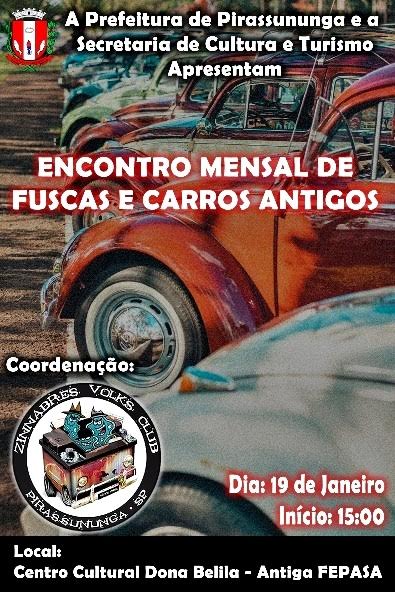 Para prestigiar e proporcionar uma experiência diferenciada para o público fiel, sob a coordenação do Zinnabres Volks Club de Pirassununga, a Secretaria de Cultura e Turismo promove neste domingo (19), às 15h, o 1º Encontro Mensal de Fuscas e Carros Antigos.