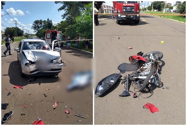 Uma mulher morreu, na tarde deste domingo (19), após bater de moto em um carro, em Pirassununga (SP). A frente do carro e a moto ficaram totalmente destruídos pelo impacto.