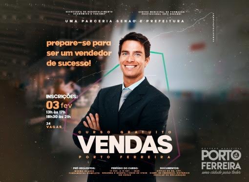 A Secretaria de Desenvolvimento Econômico e Turismo da Prefeitura de Porto Ferreira, em parceria com o Senac (Serviço Nacional de Aprendizagem Comercial), por intermédio do Centro de Formação Profissional Irpo Perondi, oferece vagas para o curso gratuito de vendedor.