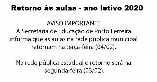 A Secretaria de Educação de Porto Ferreira informa que as aulas na rede pública municipal retornam na terça-feira (04/02).