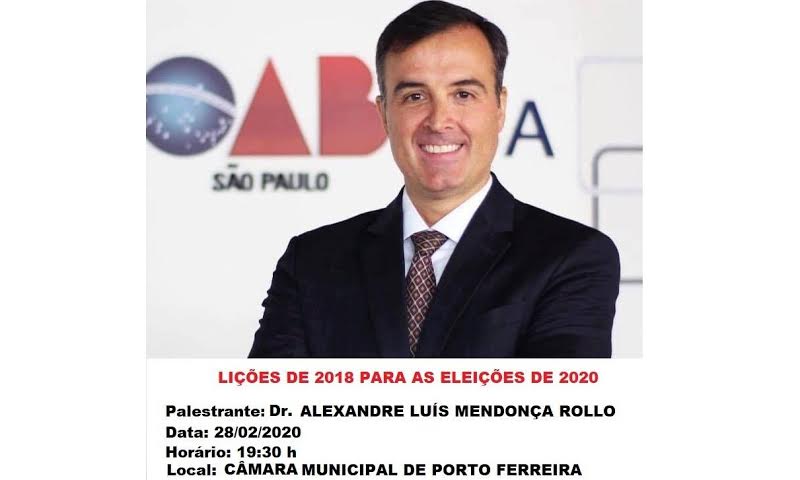 No dia 28 de fevereiro, sexta-feira, às 19h30, a Ordem dos Advogados do Brasil (OAB) subseção de Porto Ferreira, realiza uma palestra sobre as eleições de 2020 na Câmara Municipal de Porto Ferreira, localizada na avenida Engenheiro Nicolau Vergueiro de Forjaz, nº 1068.