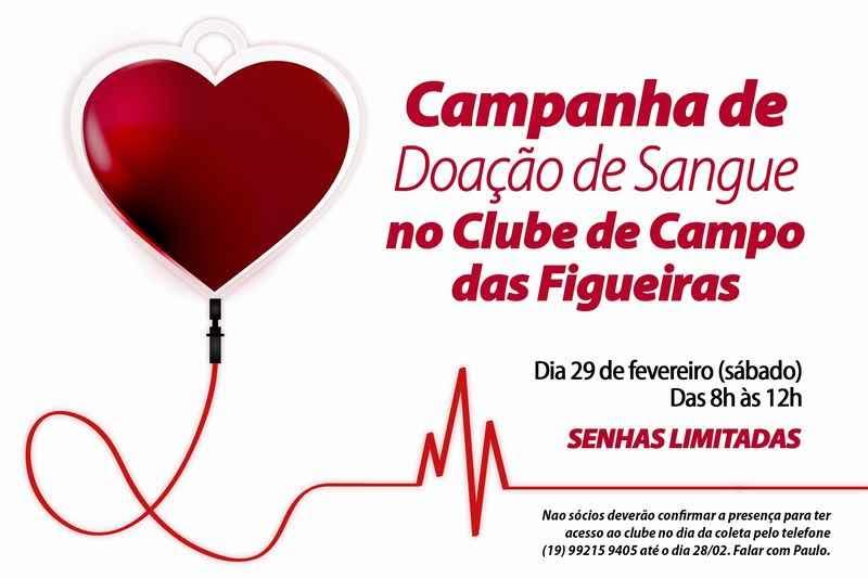 Neste sábado (29/02), das 8h às 12h, o Clube de Campo das Figueiras vai sediar uma campanha de doação de sangue em prol do Hemonúcleo Regional Jaú do Hospital Amaral Carvalho, que trata de pacientes de câncer.