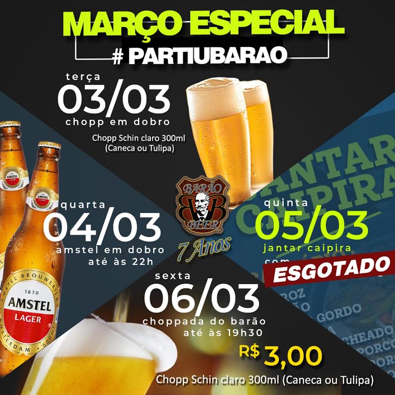 Sexta-feira (06) de Março Chopada do Barão até as 19h30 (Chopp Skin claro 300ml, Caneca ou Tulipa)