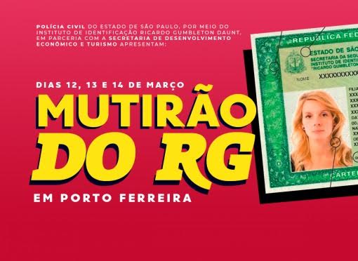 Numa parceria entre a Prefeitura de Porto Ferreira e a Secretaria de Segurança Pública do Estado de São Paulo, por meio do Instituto de Identificação Ricardo Gumbleton Daunt (IIRGD), com apoio do Sicoob Crediguaçu e Associação Comercial e Empresarial de Porto Ferreira (ACEPF), nos próximos dias 12, 13 e 14 de março (quinta-feira a sábado), a partir das 8h30, será realizado um mutirão para a emissão de carteiras de identidade (RG) no município.