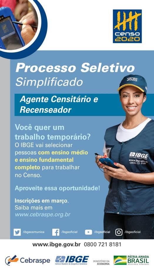 O primeiro edital divulgado, o de nº 02/2020, compreende os cargos de agente censitário. Para o posto de agente censitário municipal há uma vaga aberta e com remuneração de R$ 2.100, já para o posto de agente censitário supervisor há cinco vagas abertas e tem remuneração de R$ 1.700.