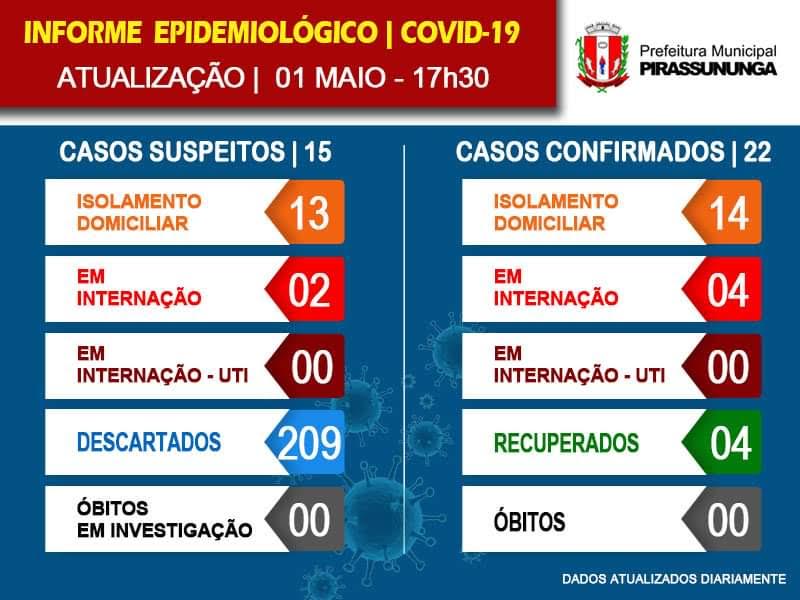 Segundo a Prefeitura, destes 22 pacientes, quatro já estão recuperados após obedecerem período de quarentena. Outros 14 estão em isolamento domiciliar e quatro estão em internação (fora da UTI). Não existem mortes decorrentes da doença em Pirassununga.