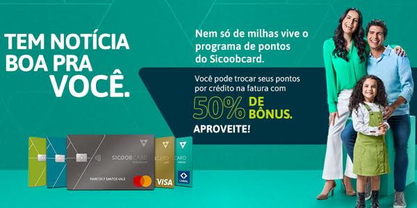 A troca de pontos por crédito pode ser feita no site www.sicoobcard.com.br, no menu programa de pontos. Além do site Sicoobcard Prêmios, é possível verificar o saldo tanto no app Sicoobcard quanto na fatura do cartão.