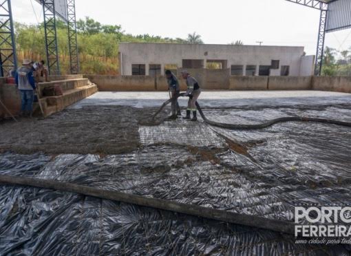 As estruturas de ferro ganharam a cobertura com telhas metálicas e também esta semana foram iniciados os serviços de concretagem dos pisos das quadras poliesportivas.
