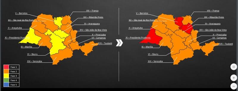 Desta forma, Porto Ferreira, que estava na fase 3 (amarela), dentro da região de Araraquara, passou para a fase 2 (laranja), com mais restrições. Na prática, isto significa que bares, restaurantes e similares não poderão mais fazer o atendimento presencial em suas áreas externas a partir de segunda-feira (15/06). Poderão continuar trabalhando apenas nos sistemas de delivery (entrega) e drive-thru (retirada no balcão).