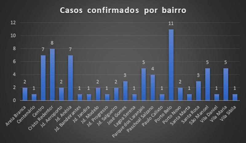 Os casos estão distribuídos geograficamente pelo município, com casos confirmados em sete novos bairros: Jardim Vyctória, Jardim Salgueiro, Jardim Aeroporto, Parque Lagoa Serena, Jardim Santa Marta, Jardim Centenário e Jardim Progresso.