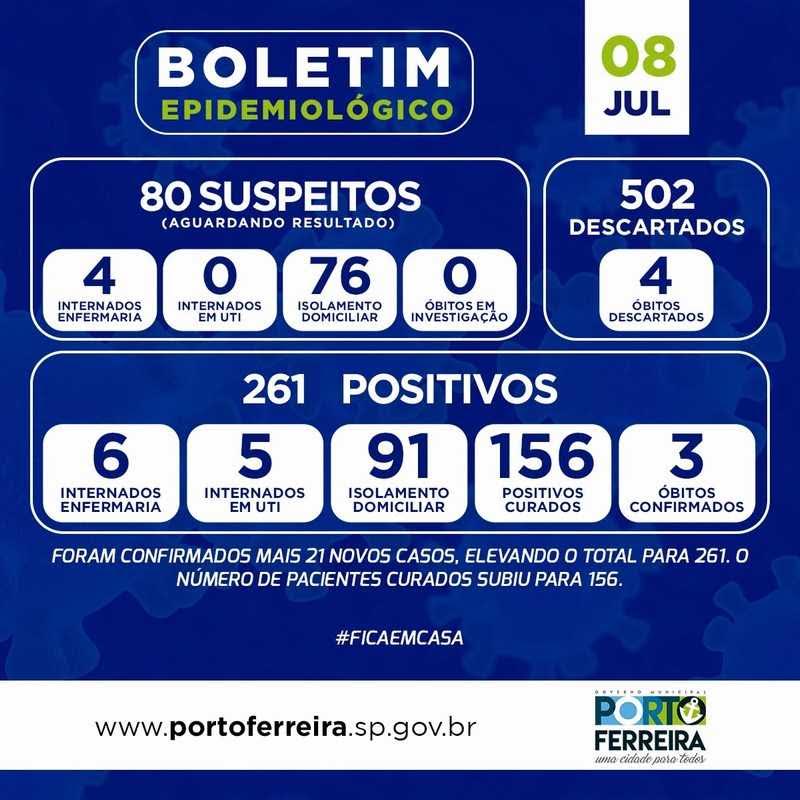 A Vigilância Epidemiológica da Secretaria de Saúde de Porto Ferreira divulgou nesta quarta-feira (08/07) o Boletim Epidemiológico nº 94/2020, atendendo à determinação prevista no decreto municipal 1.281/2020.