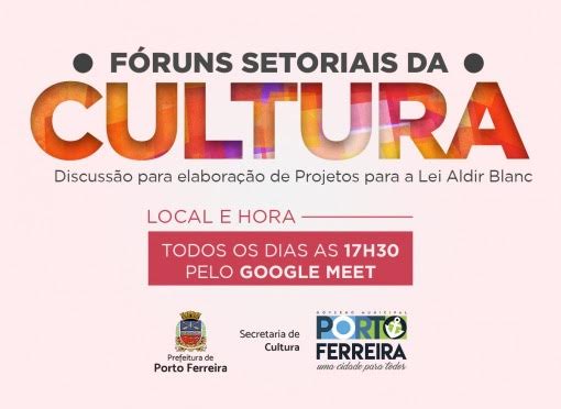 A partir de segunda-feira (13/07) a Secretaria de Cultura da Prefeitura de Porto Ferreira vai promover fóruns setoriais para discutir a elaboração de projetos para serem contemplados com recursos provenientes da lei emergencial Aldir Blanc.