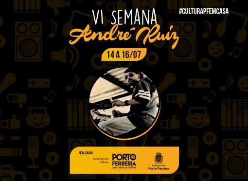 Na próxima semana, entre os dias 14 e 16 de julho (terça a quinta-feira), acontece a VI Semana Cultural André Ruiz, organizada pela Secretaria de Cultura de Porto Ferreira, seguindo o movimento #culturapfemcasa, com todas as atividades por meio de plataformas gratuitas online.